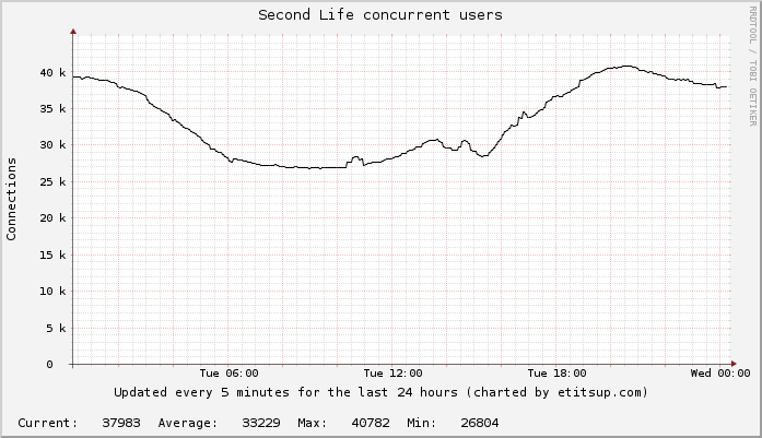 Well it’s evening and once again the Second Life asset servers are not a happy bunch. It wasn’t hard to notice in world before the grid wide announcement not to do anything with your inventory. From the live statistics graph I’m running I can already see that already 10,000 people have logged off or crashed off from the service (and counting). I wonder how many will disconnect or be disconnected before it’s fixed.
